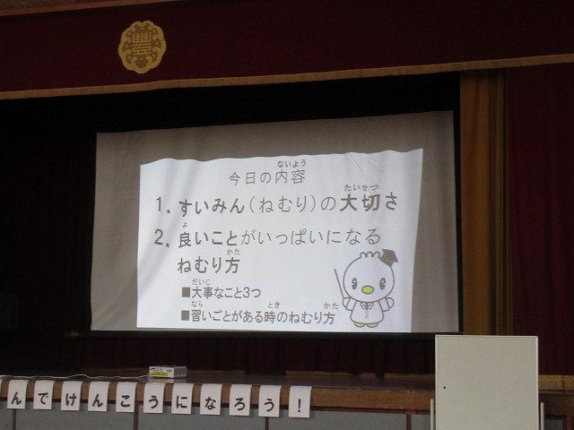 本日5時間目、学校保健委員会がありました。東洋羽毛 睡眠健康指導士 渡部郁子先生に「よいすいみんで、けんこうになろう!」とうテーマで話していただきました。睡眠によって心も体も元気になることや眠っている間に学習したことを体が覚えることを学びました。また、よい睡眠にするために、休みの日も平日と同じ時刻に起きるようにしたり、ゲームや動画は寝る時刻1時間目に終えたりすることが大切だと分かりました。今日からよい睡眠になるように、とよはまっこみんなでがんばっていきましょう。
