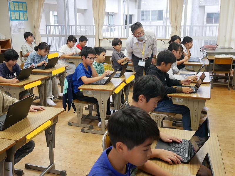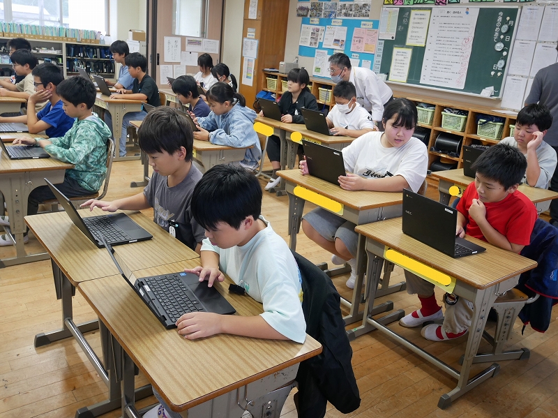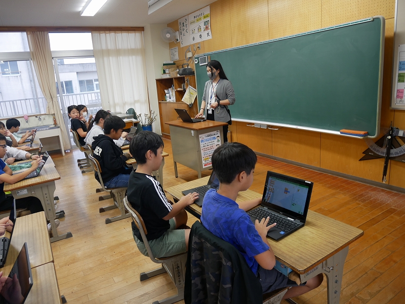 5年生は、情報教育でプログラミングの学習をしていました。ポケモンプログラミングの教材を使って、ピカチュウを動かすプログラミングの体験をしていました。子どもたちは、ICT支援員さんの説明を聞いて、すぐに使いこなしていました。