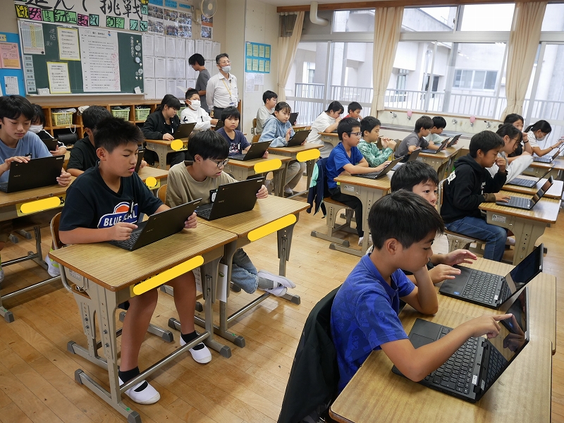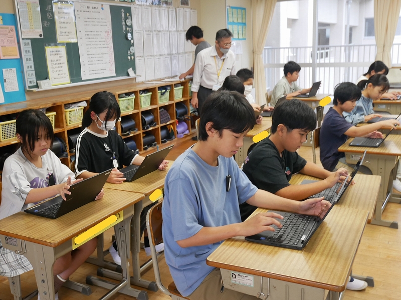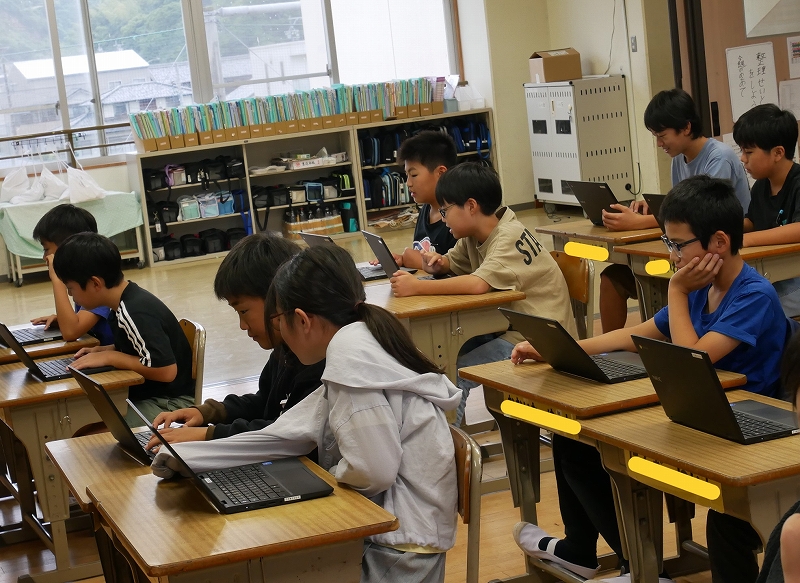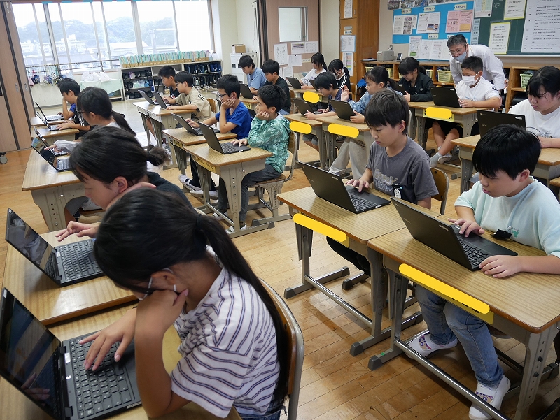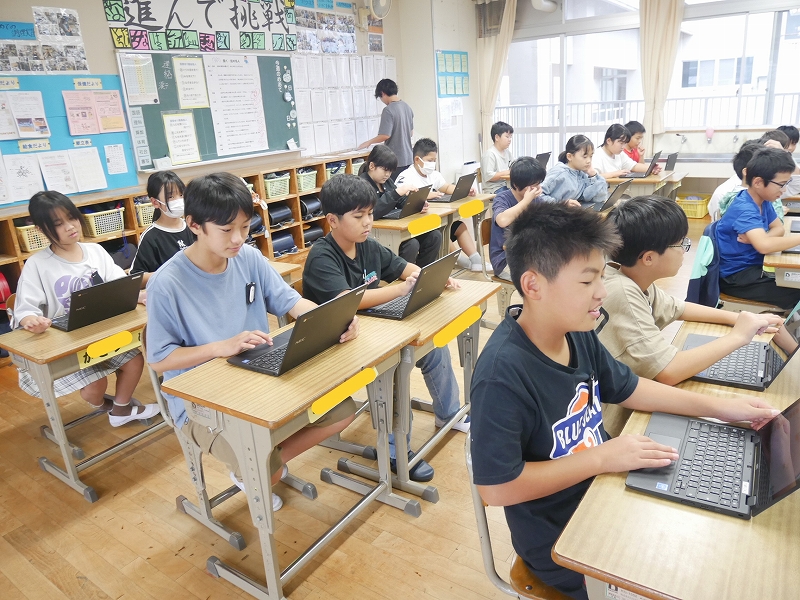 5年生は、図工の時間に「銀河鉄道の夜」からイメージした絵画作品の振り返りをしていました。自分の作品や友達の作品の良いところをタブレット端末を使って入力していました。