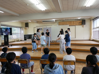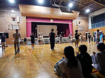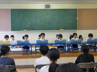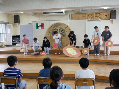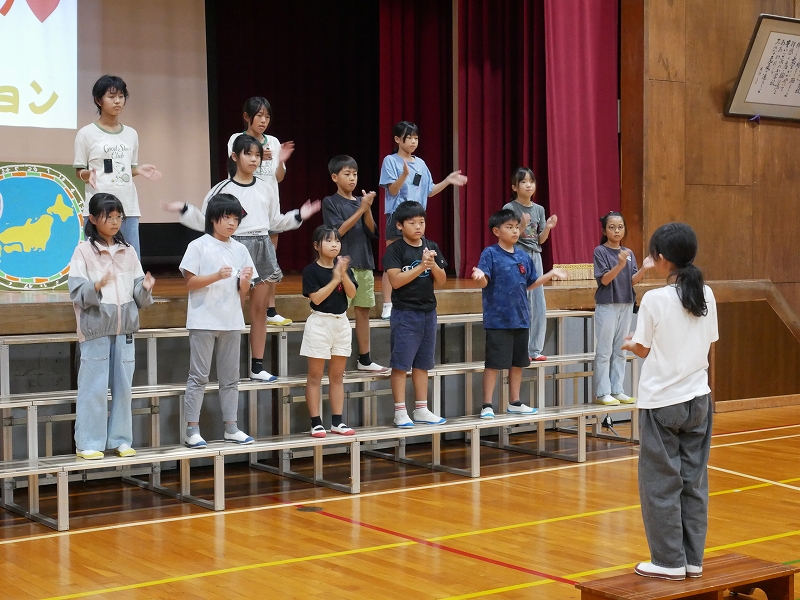 いよいよ明日は、学習発表会。今日は5年生、1年生、4年生、6年生が1つ下の学年(1年生には6年生)を招待してリハーサルを行いました。