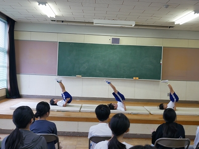 6年生は、体育の時間に体育館で表現運動をしていました。タブレット端末で動画を見たり、友達と教え合ったりしながらダンスの練習をしていました。