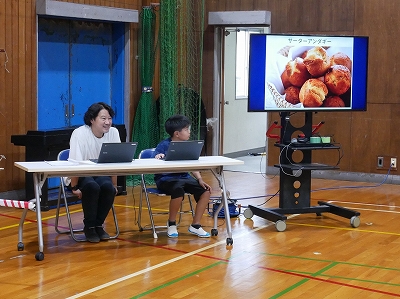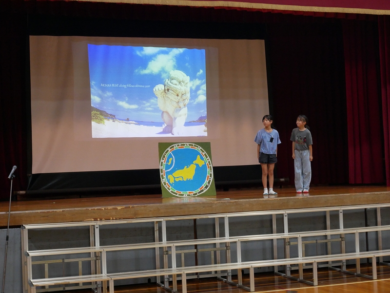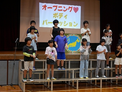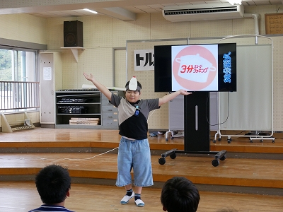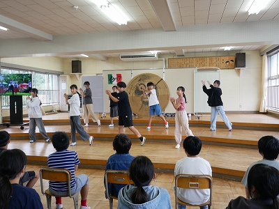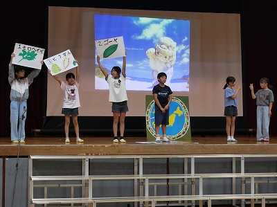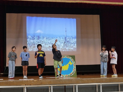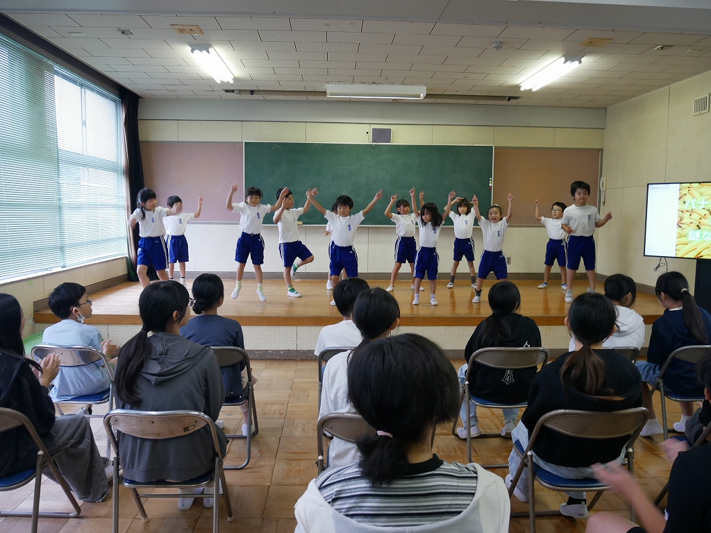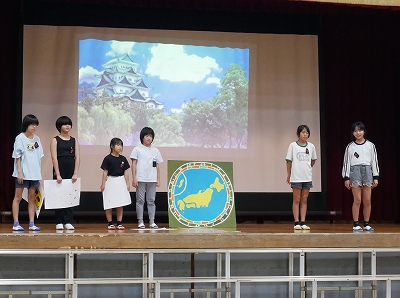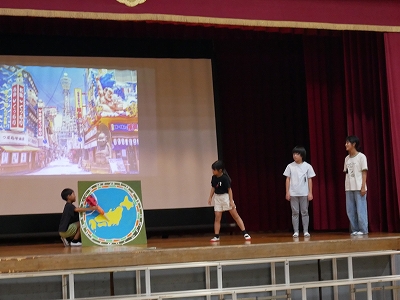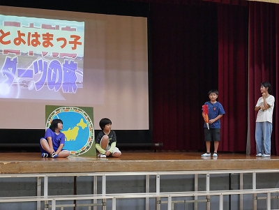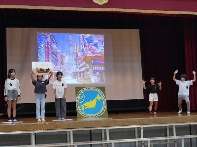 4年生は、テレビ番組のダーツの旅に入り込んだ子どもたちが沖縄県、大阪府、東京都、そして愛知県の良さを知っていきます。学習したことを分かりやすく発表しました。ボディパーカッションや歌、踊りも披露します。