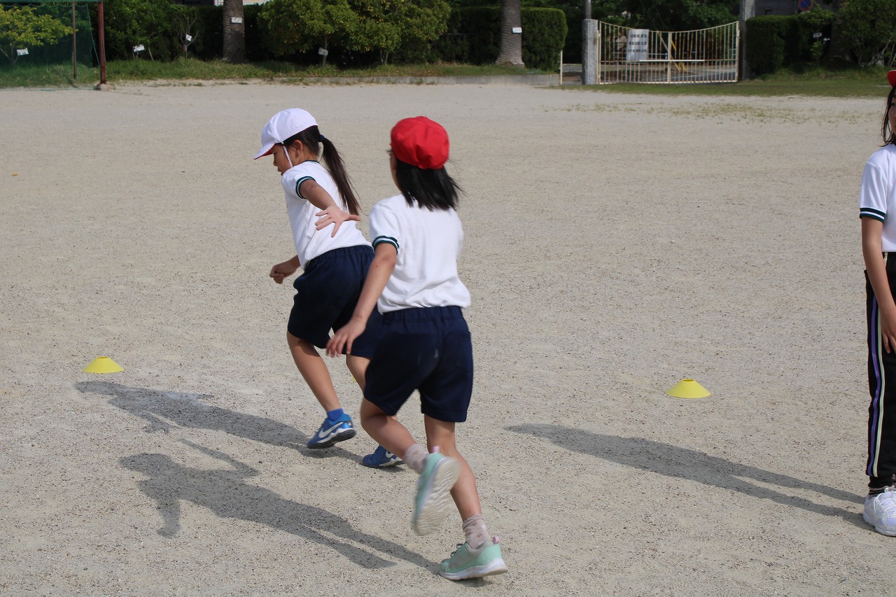 4年生が体育で、リレーのバトンパスの練習をしていました。お互いがトップスピードに乗った状況でのバトンの受け渡しは難しく、子どもたちは繰り返し練習に取り組んでいました。リレーは、個人の走る能力が勝負の大きな要因ですが、いかにスムーズにバトンの受け渡しができるかどうかも重要であり、この競技の醍醐味でもあります。「協力する心」が育まれそうです!