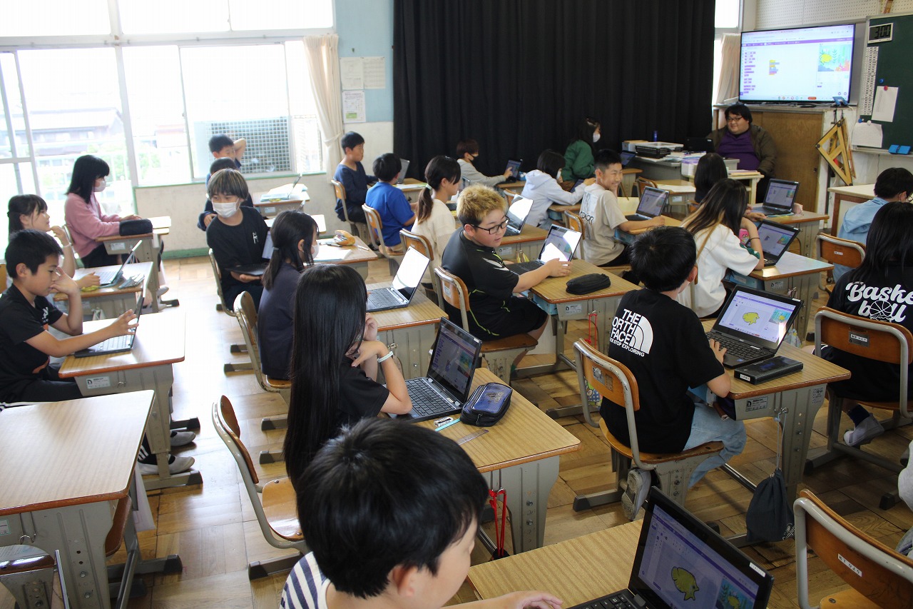 最後は、5年生。プログラミングの学習をしていました。コンピュータのプログラムとは、一体どういうものかを動画を見て学んでいました。