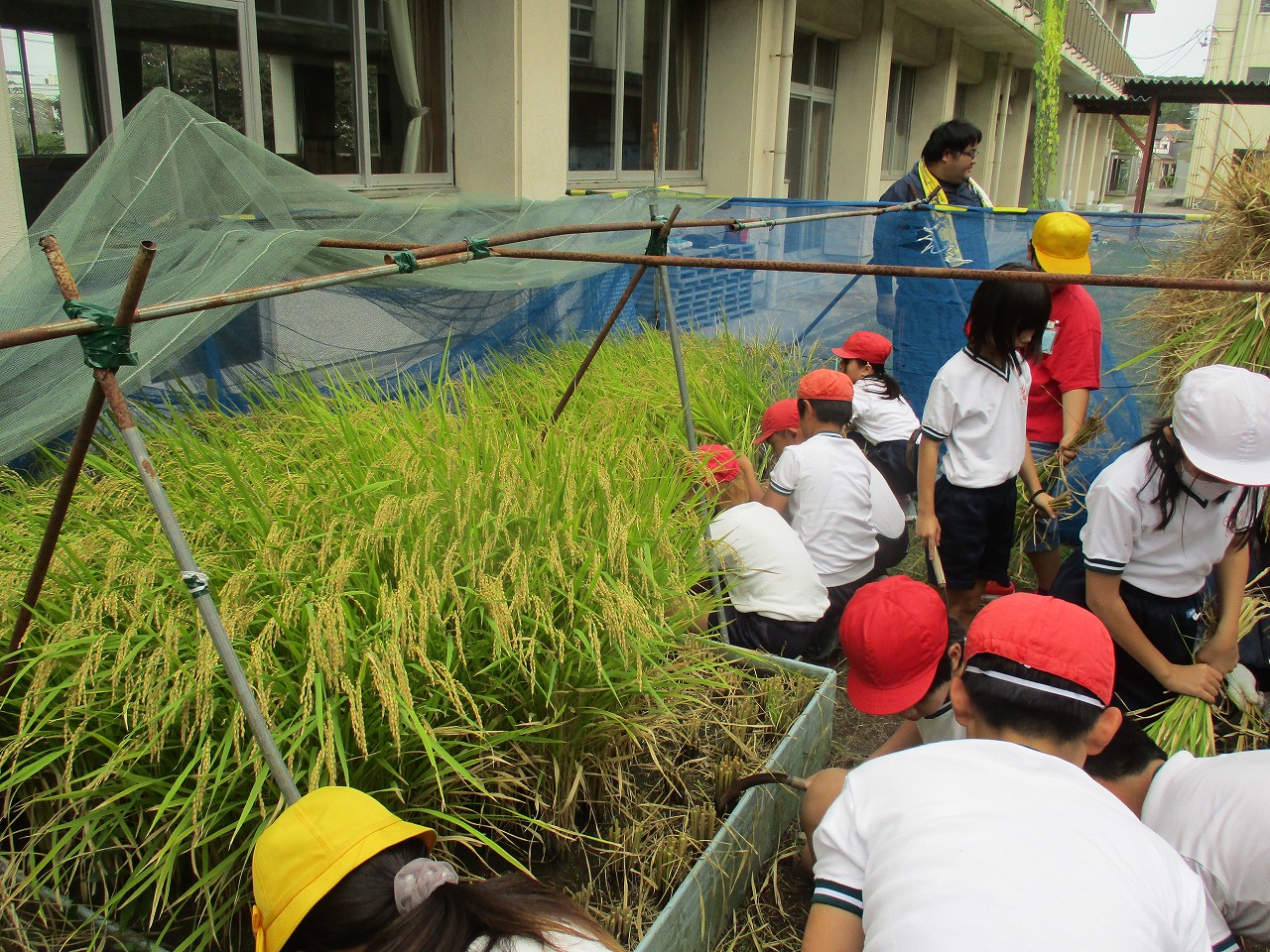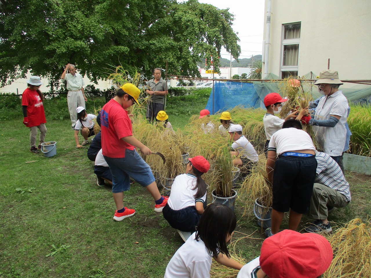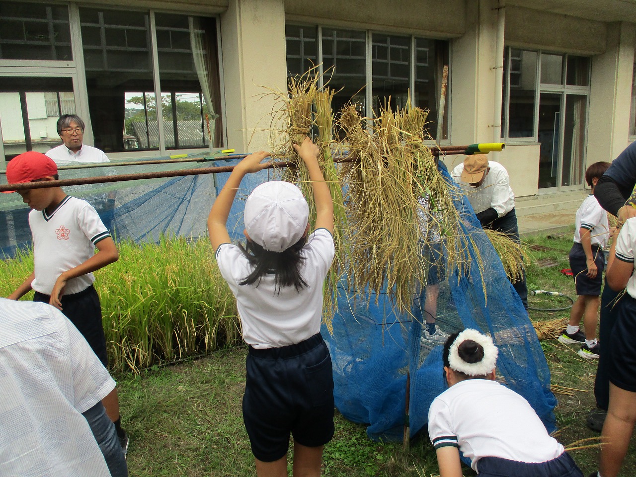 今日の5時間目は,5年生が稲刈りをしていました。内海小応援隊のみなさんを講師にお招きして,稲の刈り方や稲架掛け(はさかけ)の仕方を教えていただきました。束ねた稲を稲架(はさ)に掛けて天日と風で乾燥させます。稲を束ねることに苦戦していました。無事に乾燥できたら,いよいよ脱穀です。おいしいご飯に近づいてきましたね。