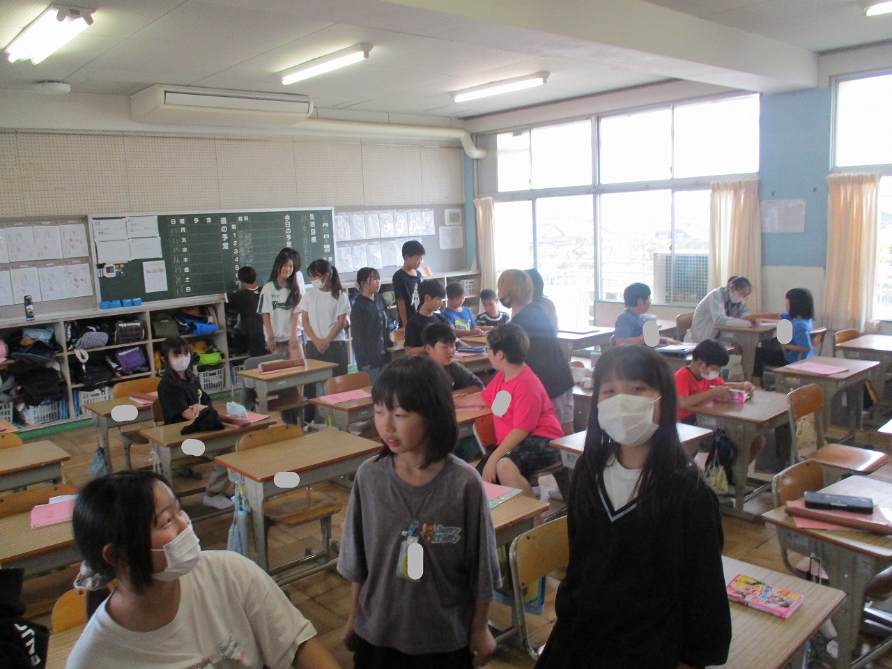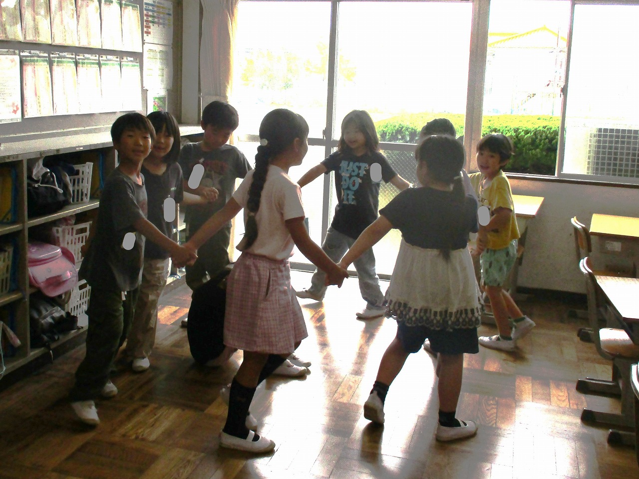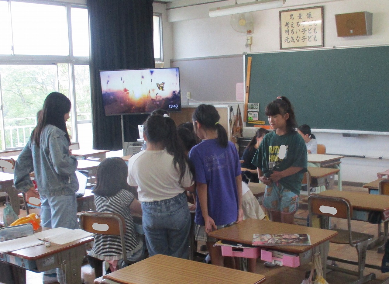 今日は運動場で遊べないため,昼放課は教室で過ごしていました。友達や先生と話をしたり,絵を描いたり,昔ながらの遊びである「かごめかごめ」をしたりして過ごしていました。