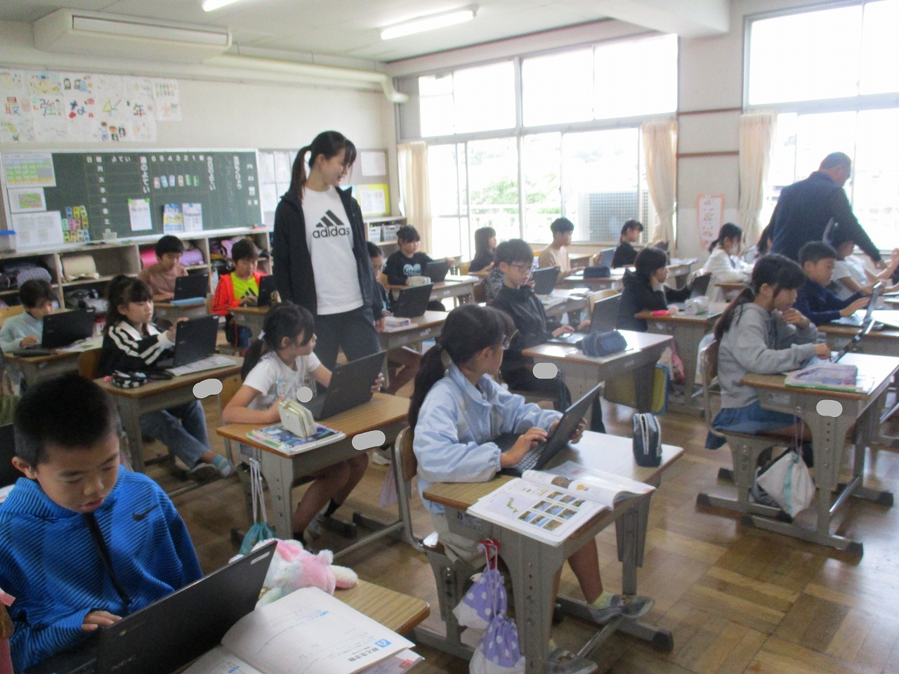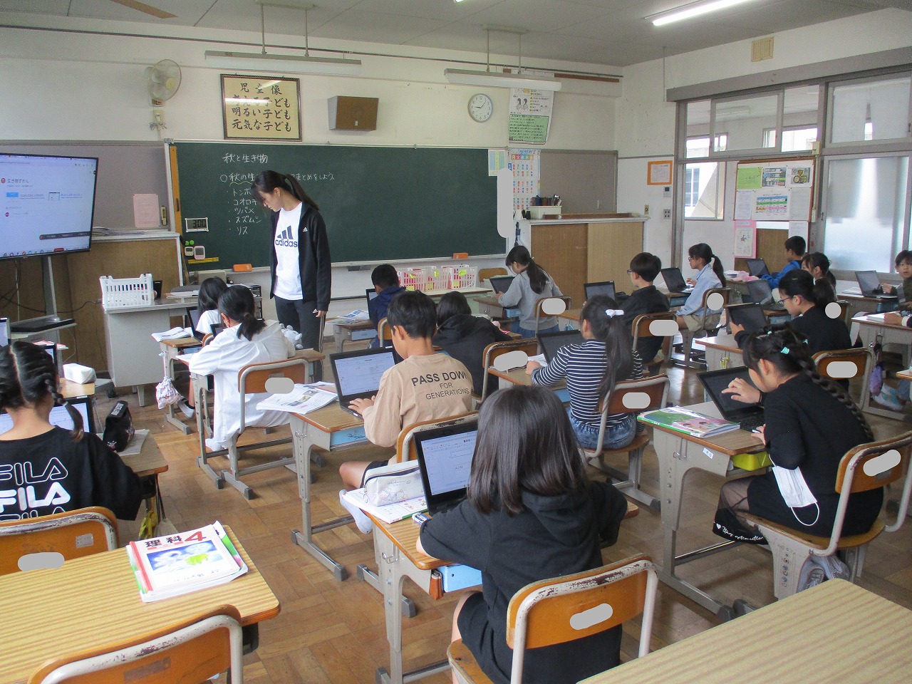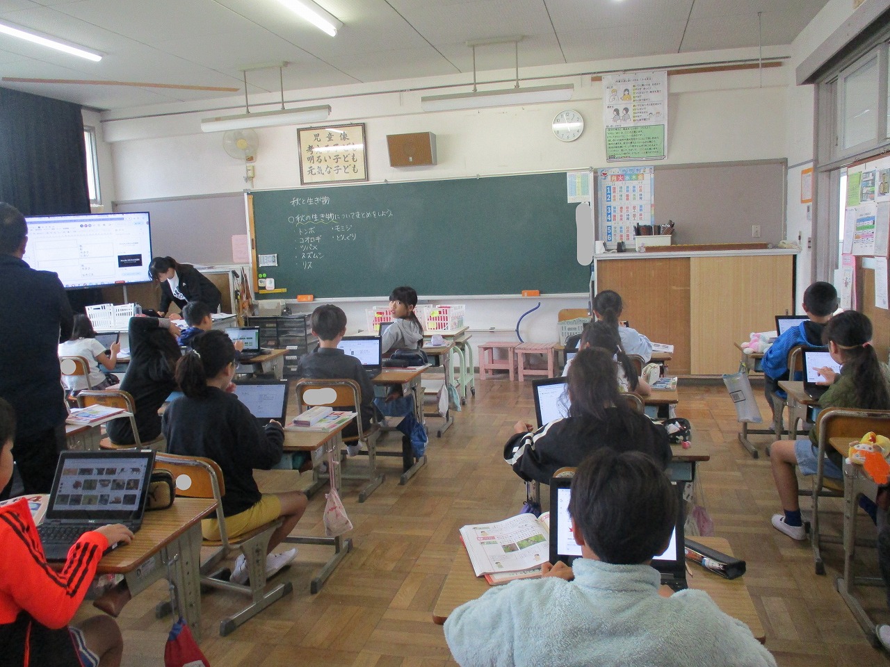 今日の1時間目は,4年生が理科の勉強をしていました。秋の生き物を1つ決めて,スライドを各自1枚ずつ作成していました。昨日の1年生と同じで,「形」「色」「大きさ」「におい」などについて,インターネットで調べたり写真を取り込んだりしながらまとめていました。
