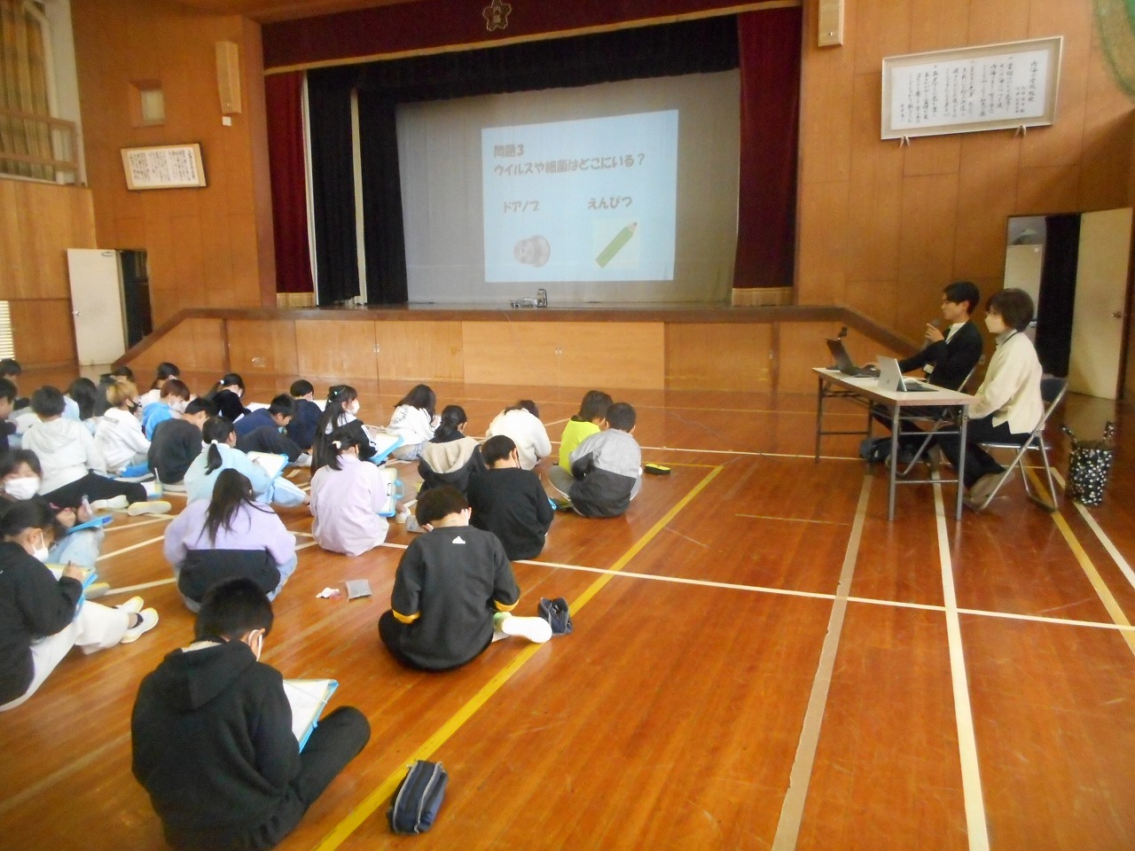 また,今日の2時間目は,4~6年生が参加した第2回学校保健委員会がありました。まずはじめに,生活安全委員会の6年生が内海小学校のかぜ予防の取り組みについて発表しました。次に,南知多町保健センターから来ていただいた講師の保健師さんから「かぜ(感染症)を予防して元気に冬を乗りこえよう」というテーマでお話をしていただきました。「ウイルスの苦手なものは手洗い」「石けんと水でウイルスを100万分の1に減らせる」「石けんで手を洗ったらきれいなハンカチで拭く。拭いたあとに消毒をする」「毎日,清潔なハンカチを持ってくる」など,手洗いについてたくさん話を伺うことができました。最後に,委員会で考えた「かぜ予防川柳」を紹介しました。今日,振り返りプリントを持って帰ります。ご家庭でも話題にしていただき,ご家族みなさんでかぜ予防に取り組んでください。