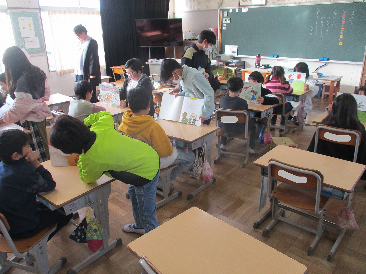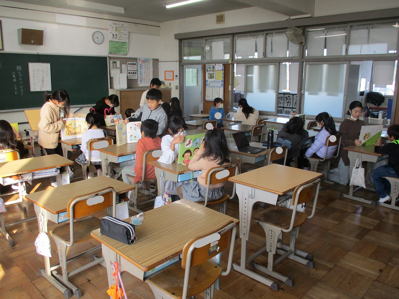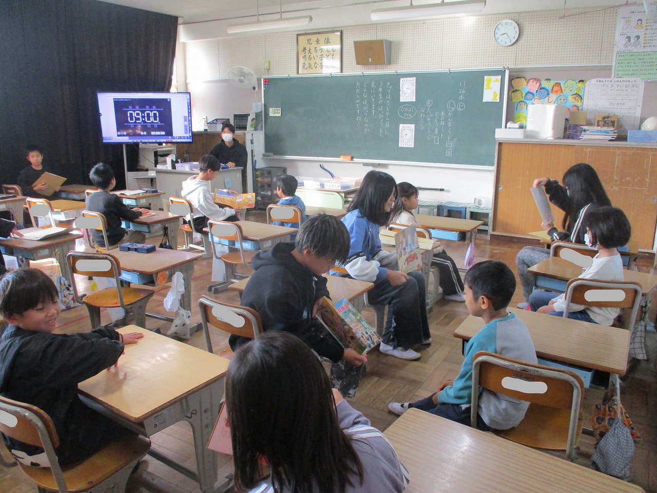 今日の朝の読書タイムは,なかよしグループの読み聞かせ会でした。4~6年生は,事前に低学年が喜んでくれそうな本や紙芝居を選んで読む練習をしていました。1~3年生は,おにいさんやおねえさんが読んでくれるのを真剣に聞いている姿が見られました。
