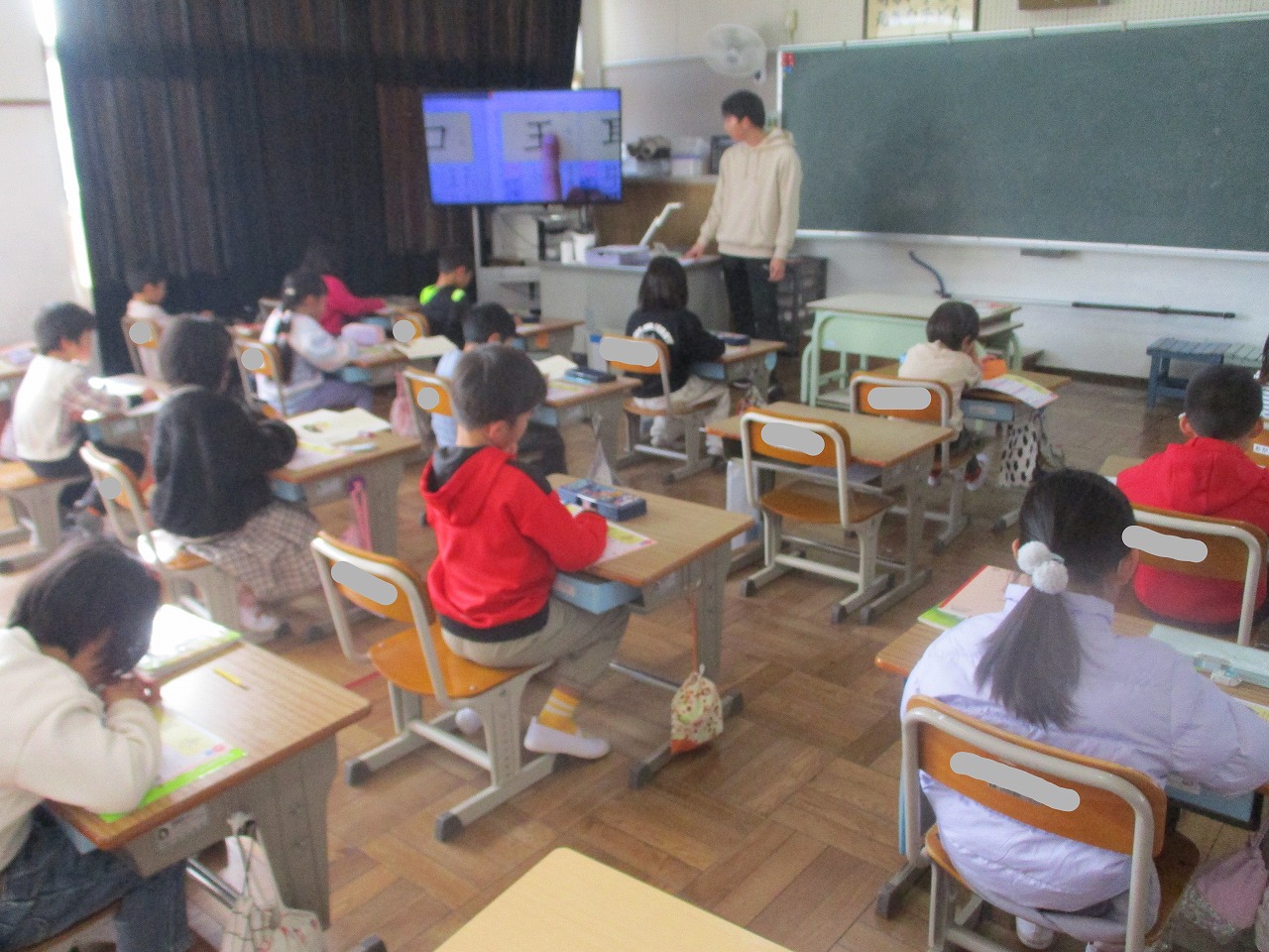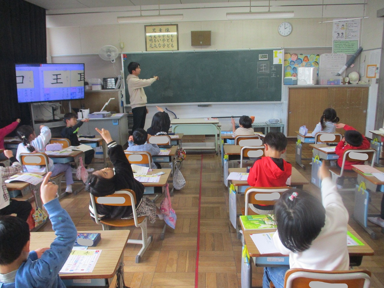 今日の5時間目は,1年生が国語で漢字の学習をしていました。2学期に引き続き,3学期も新しい漢字を学習します。今日は,「王」や「口」の読みを確かめたり書き順を先生と一緒に何度も確かめたりしていました。先生が「王は何かに似ているね」と聞くと「玉に似ている」と答えたり,先生から「口(くち)はカタカナのロと同じだから『いり口(いりぐち)』を『いりロ(いりろ)』と読まないように文をよく見てくださいね」という話を聞いたりしていました。