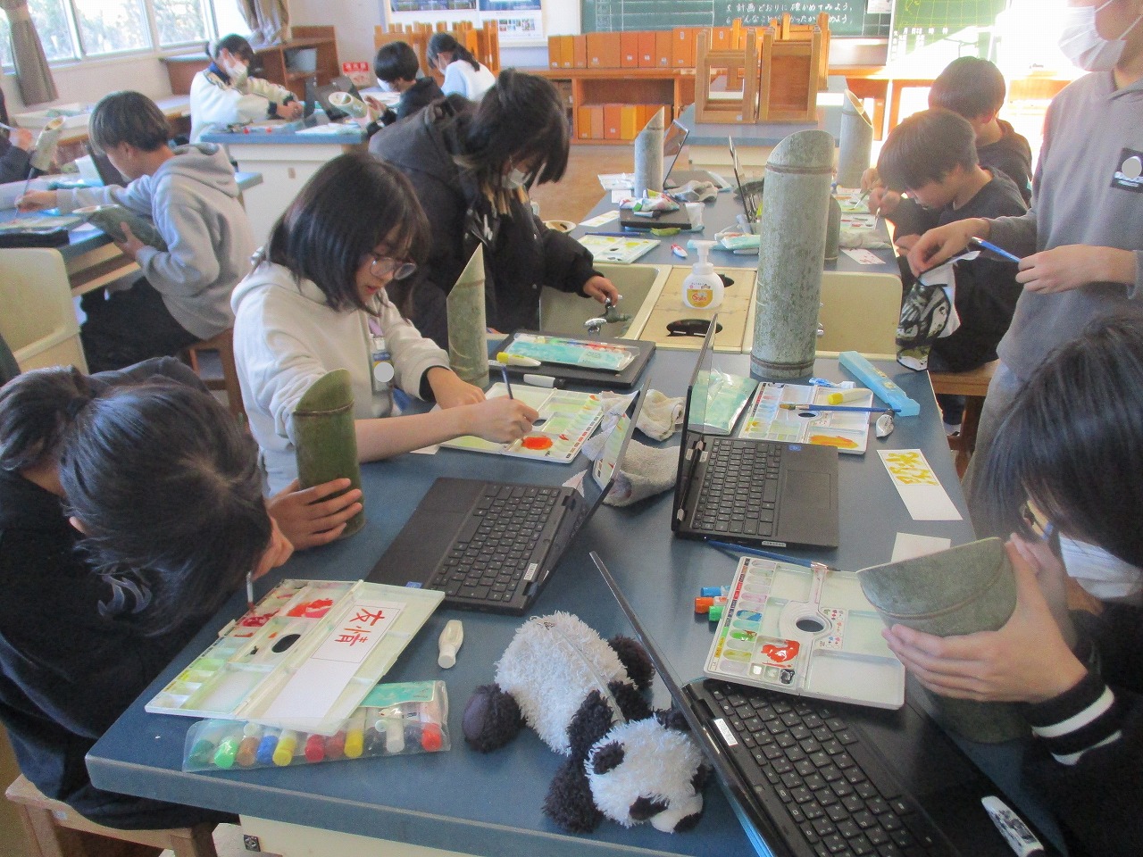 また,今日の5時間目と6時間目は,6年生が地域の方に講師として来ていただき,「笑福竹づくり」をしました。事前に竹に書く字を決めていました。今日は,その漢字をデコレーションする感じで描いたり富士山を好きな色で塗ったりしました。どの作品も,とても個性的でした。ぜひ家で飾ってくださいね。