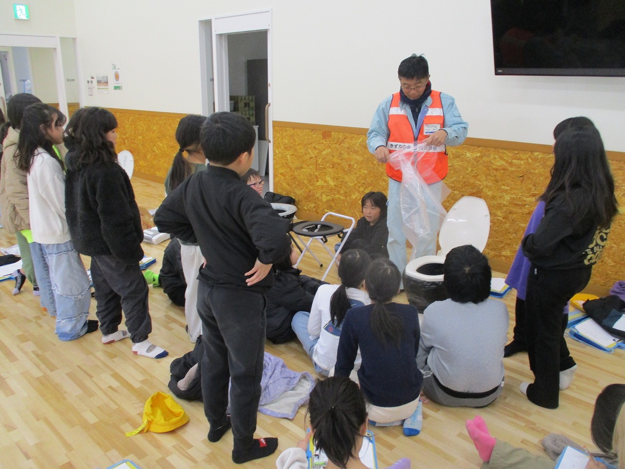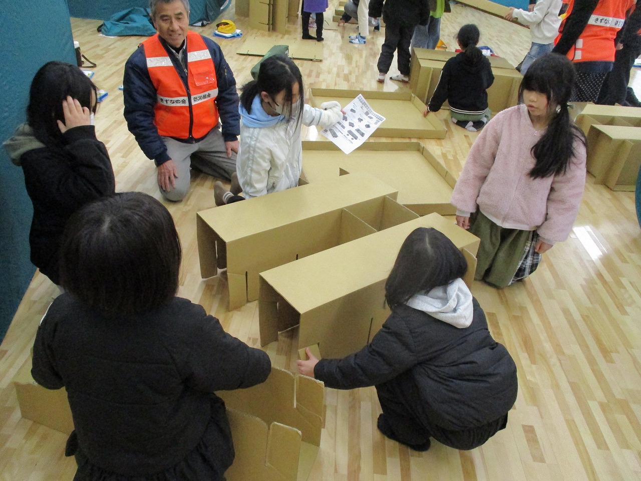 4年生が防災学習の一環で、内海防災センターに行きました。役場職員の方やきずなの会の皆さんに、パーティションや簡易ベッド・ダンボールベッドの組立・設置の仕方を教えてもらい、実際に設営体験をしました。また、簡易トイレの必要性についても教えていただき、排泄物に見立てた水を凝固剤で処理する体験に、子どもたちは興味津々で取り組んでいました。締めくくりに、「災害発生時は地域防災の戦力になってほしい」とのお話があり、気の引き締まる思いになりました。役場職員の皆様、きずなの会の皆様には、たいへんお世話になりました。ありがとうございました。