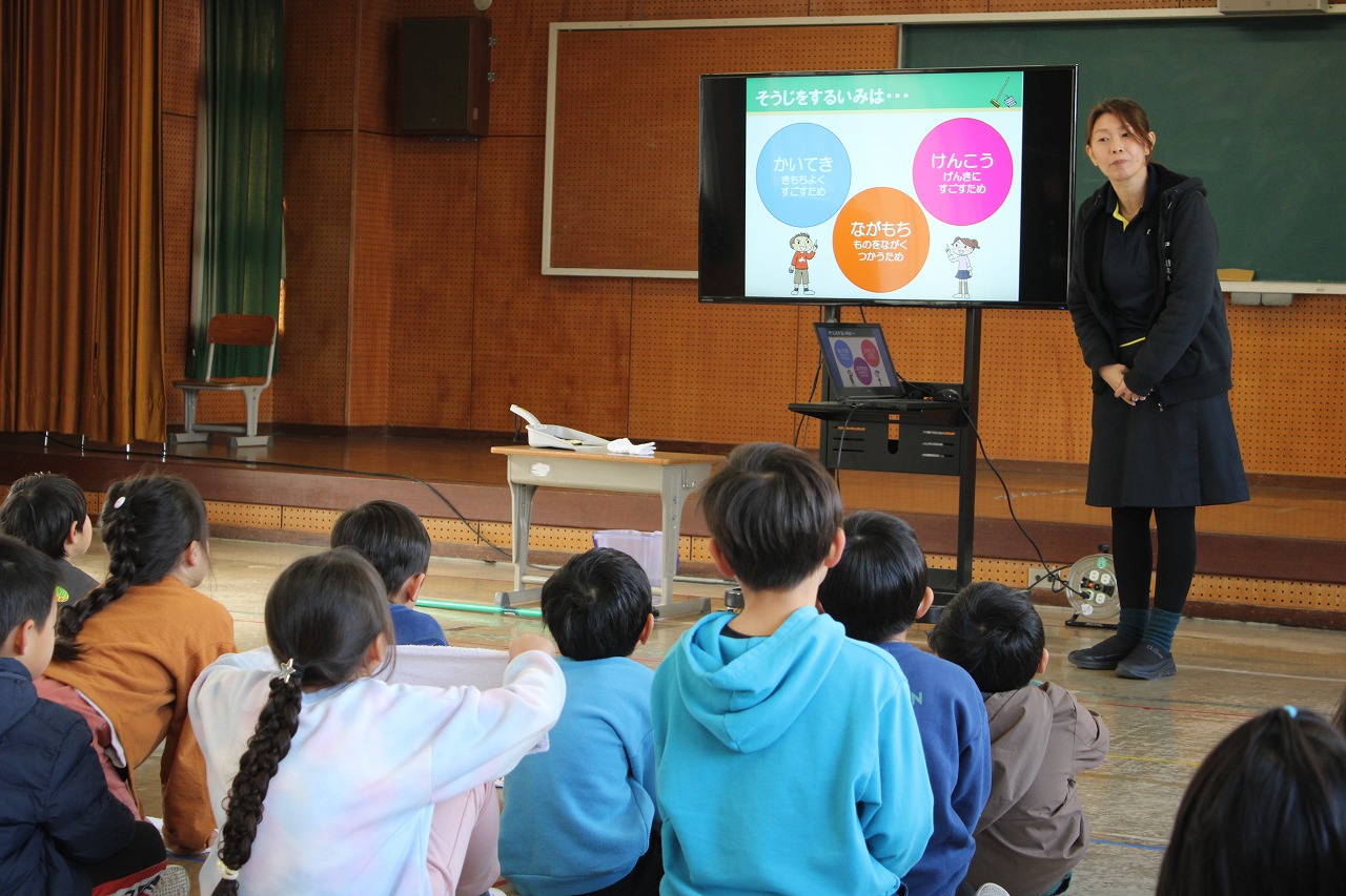 昨日の3時間目に,1年生がダスキンの方に講師として来ていただき,出前授業をしていました。そうじをする意義を知り,ぞうきんのしぼり方やほうき・ちりとりの使い方を教えてもらいました。ほこりを舞い上げてしまうと,8時間かけてまた床に落ちてくるそうです。また,机はまわりを拭いてから中をS字で拭くときれいに拭くことができることも教えてもらいました。きれいな場所で生活するために,教えてもらったことを実践してくださいね。