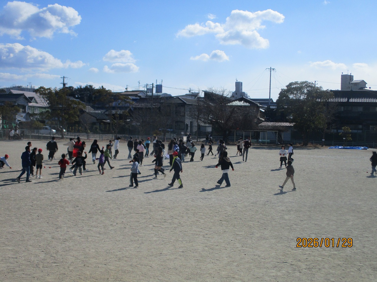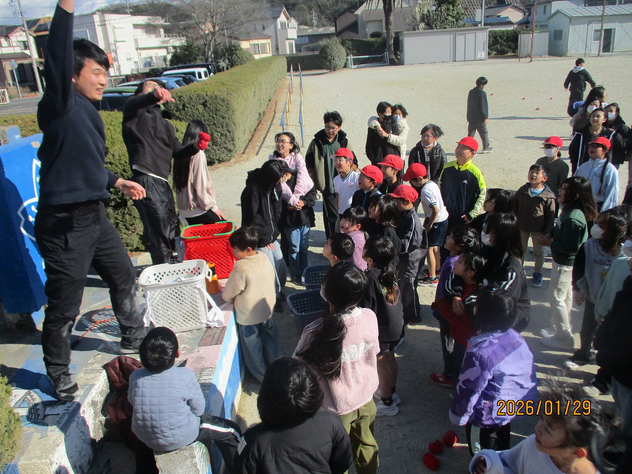 また,今日の昼放課は,児童会が企画したニコニコ交流会がありました。「追いかけ玉入れ」をしました。学年ごとに玉の色や入れるかごの色が決まっていて,相手のかごに入れてしまったら相手の得点になってしまいます。かごは先生が背負っていました。かごを背負って走る先生が背が高くて上手く投げられなかったり,先生が走るのが速くてかごに入れられなかったりしていました。児童会のみなさん,楽しい企画をありがとうございました。また楽しみにしています。