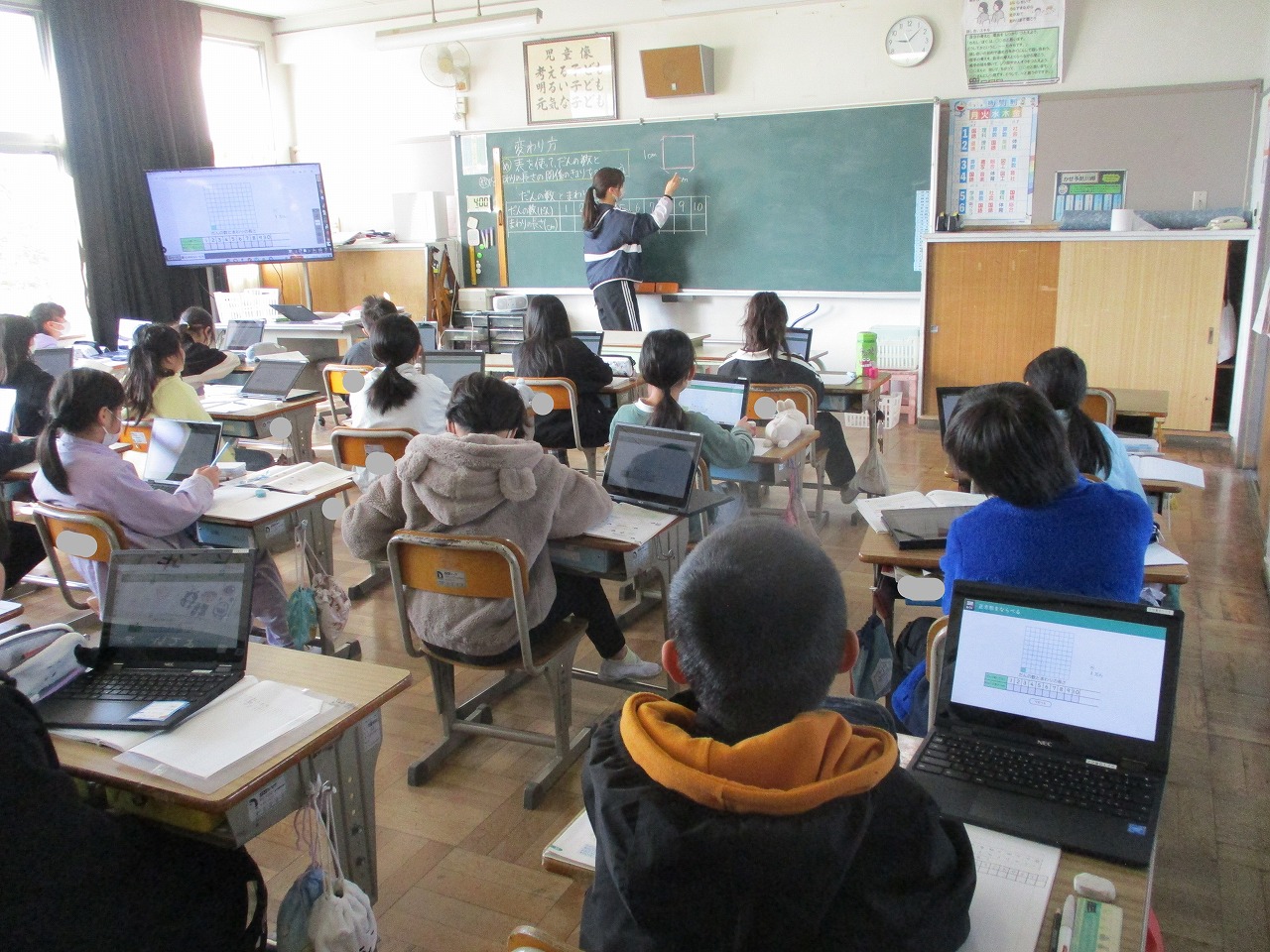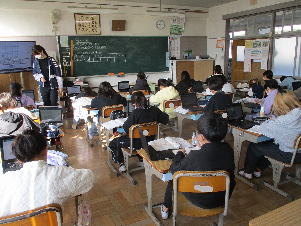 今日の1時間目に,4年生が算数の勉強をしていました。「変わり方」という単元で,表を使ってともなって変わる2つの数の関係のきまりを見つける問題に取り組んでいました。表を完成させて,無事にきまりを見つけることはできましたか。