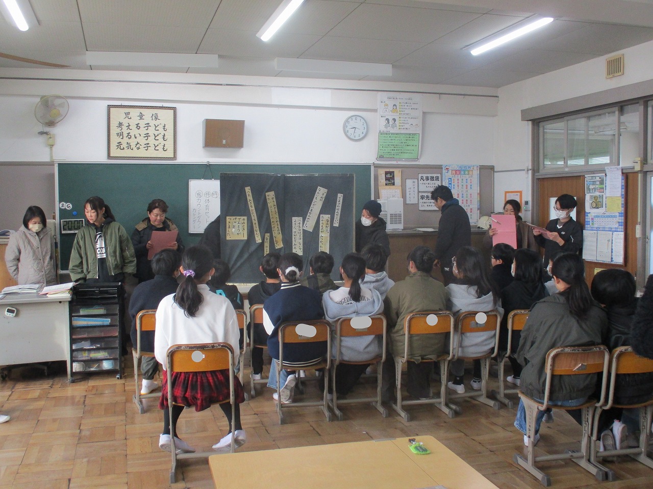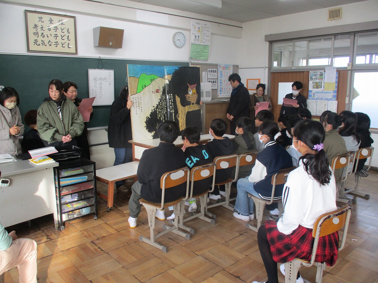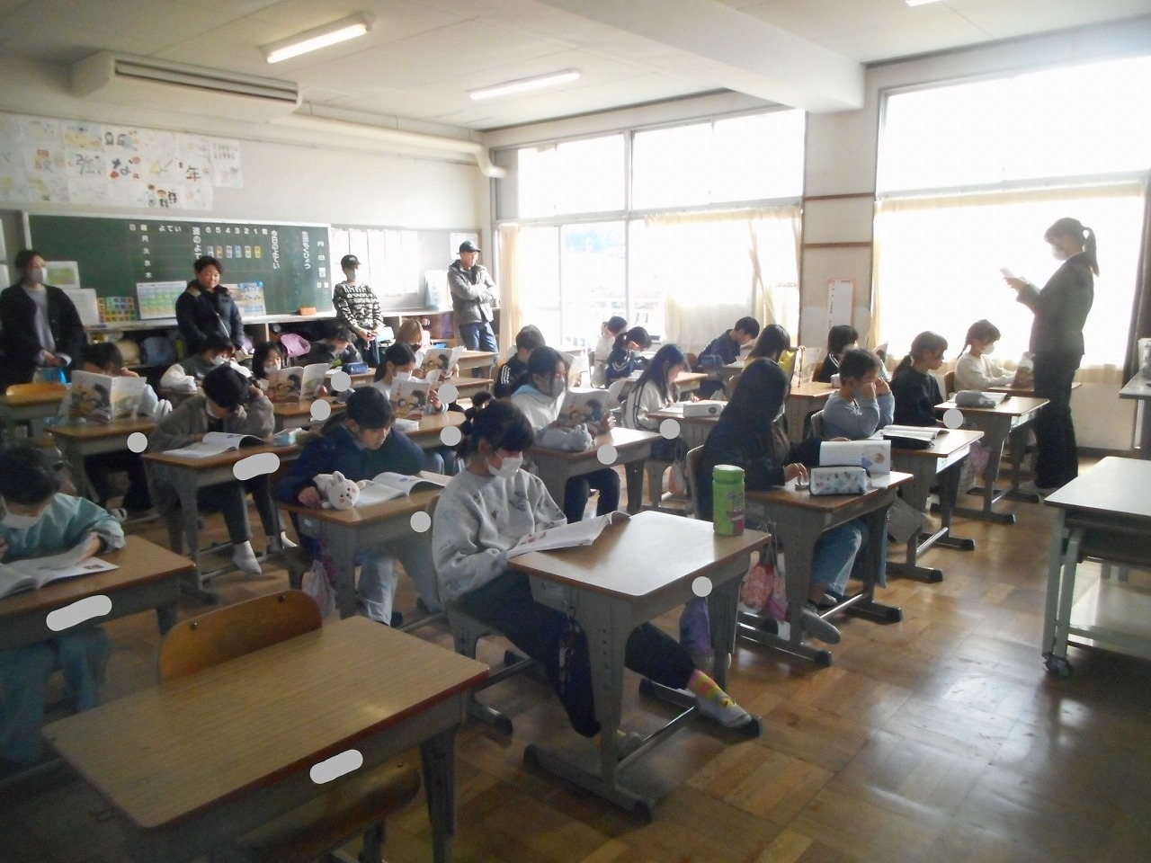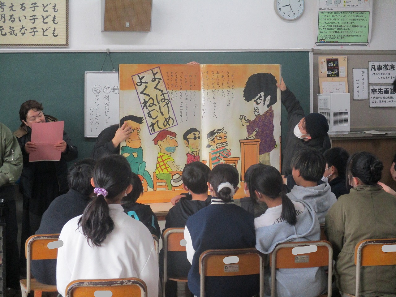 今日の読書タイムは,6年生はめだかの学校さんによる大型紙芝居がありました。小学校生活最後の読み聞かせ会となりました。タイトルは「泥棒學校」でした。とても大きな紙芝居で,拍子木や効果音の演出もありました。6年担任も急遽参加しました。6年間,本当にありがとうございました。