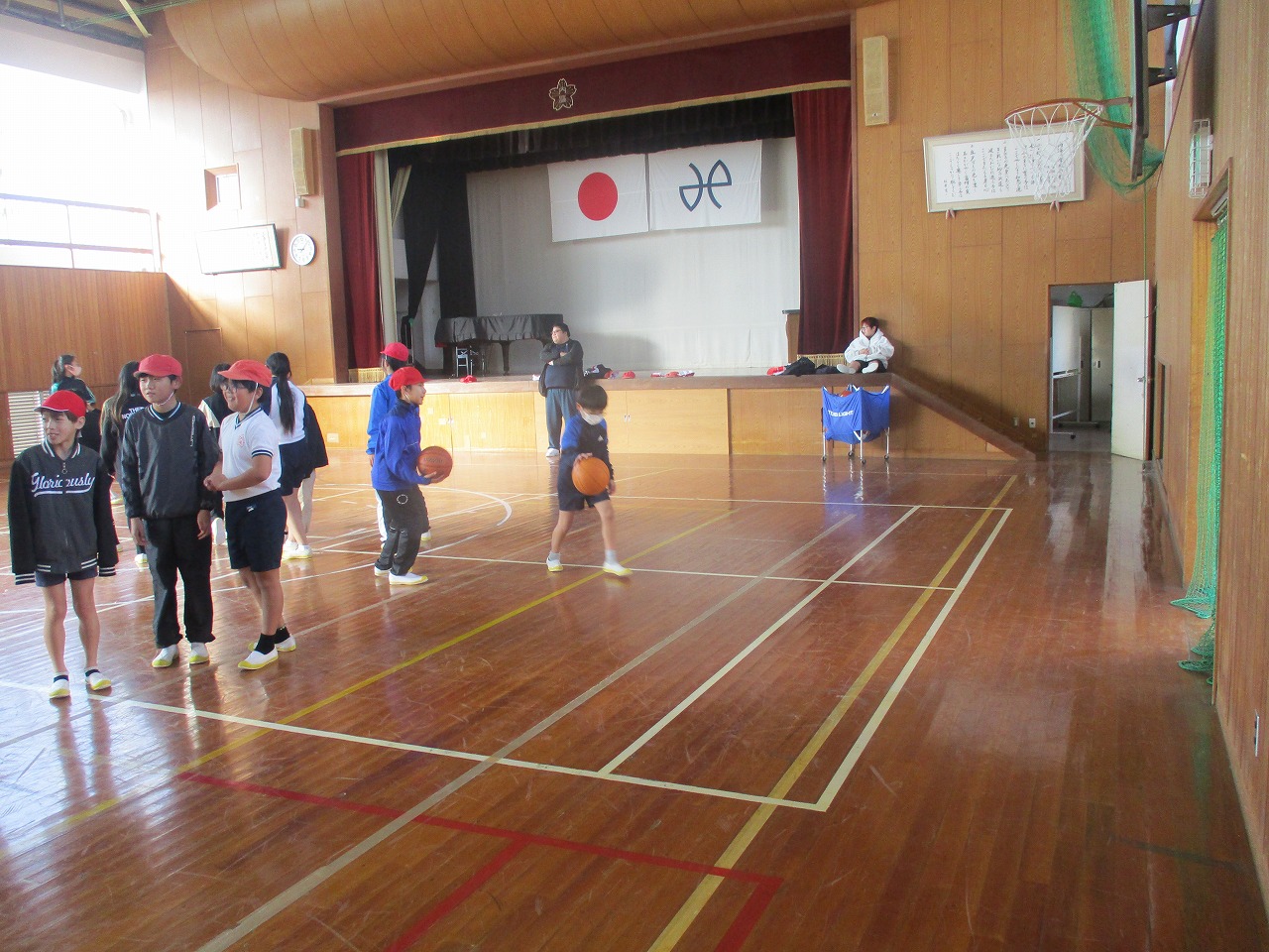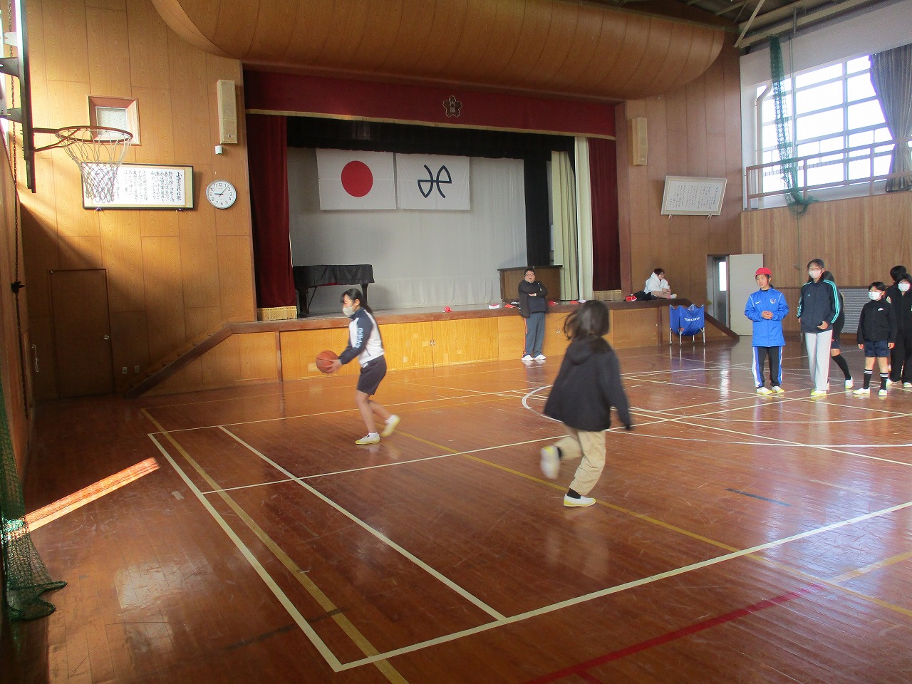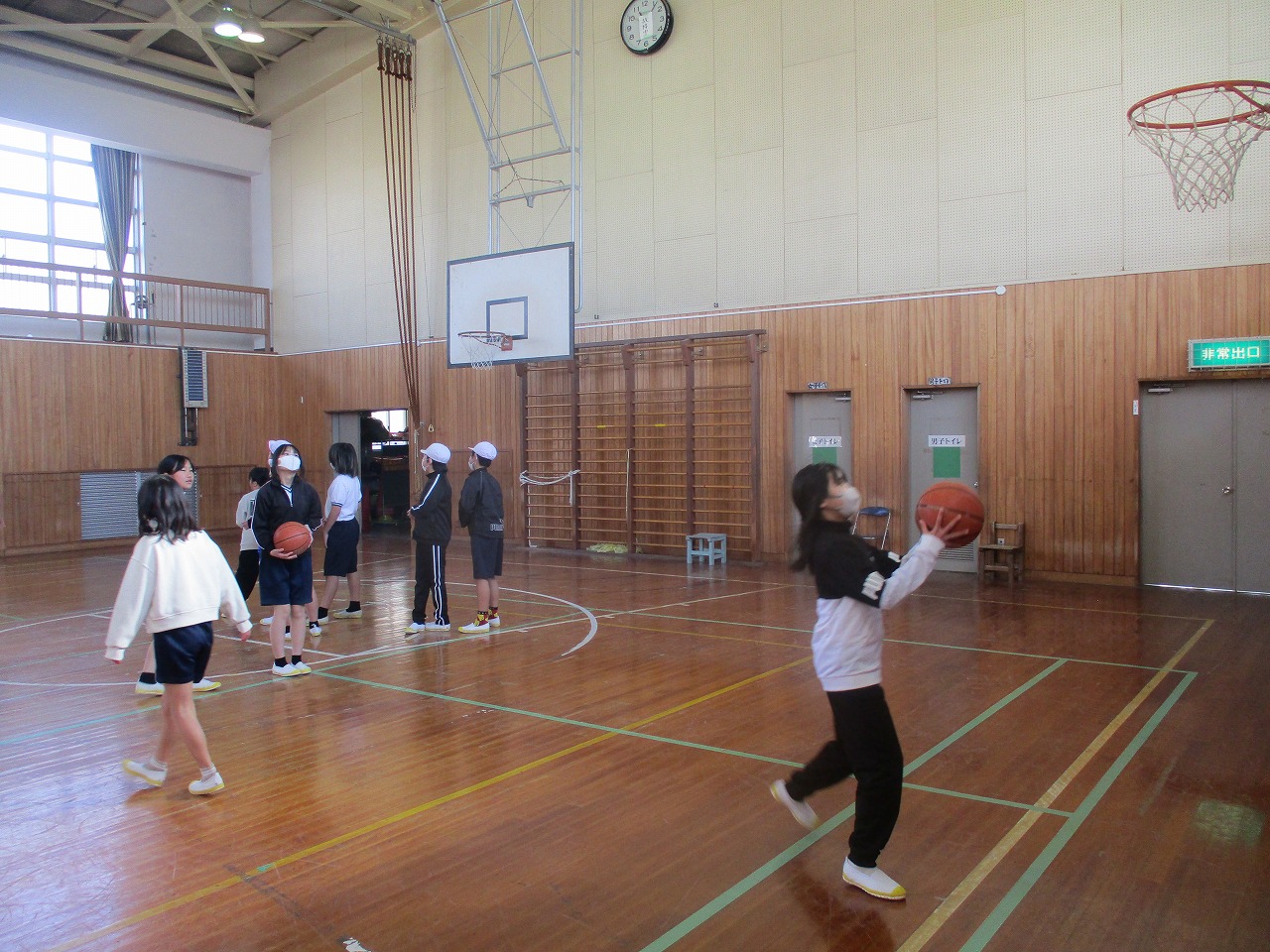 今日の1時間目は,5年生が体育でバスケットボールのシュート練習をしていました。重たいバスケットボールを自分の背よりもずっと高いリングに入れるために一生懸命シュートしていましたが,思った通りに入らなくて何度も練習する姿が見られました。