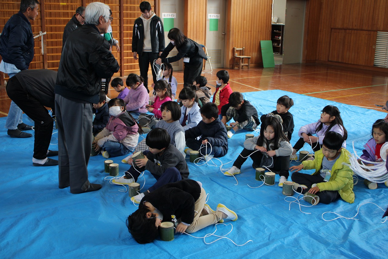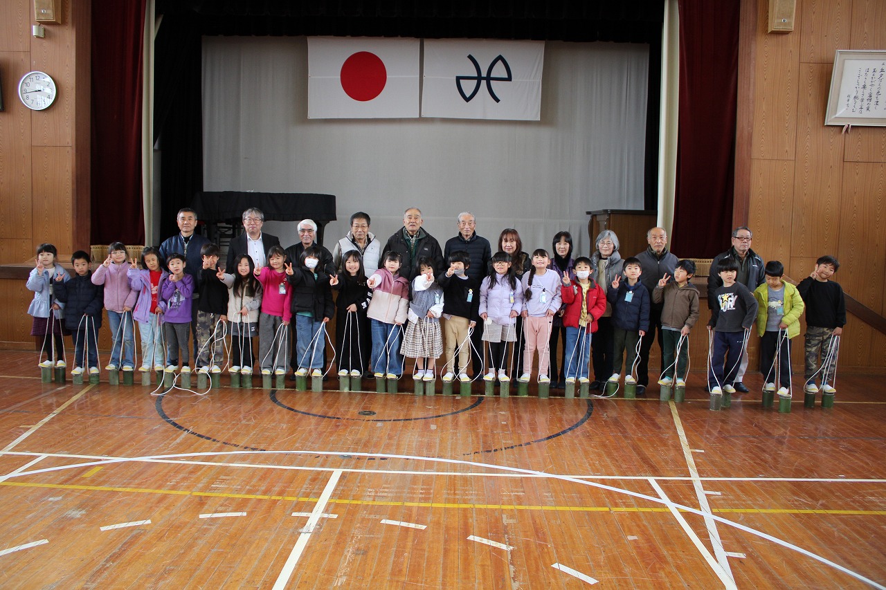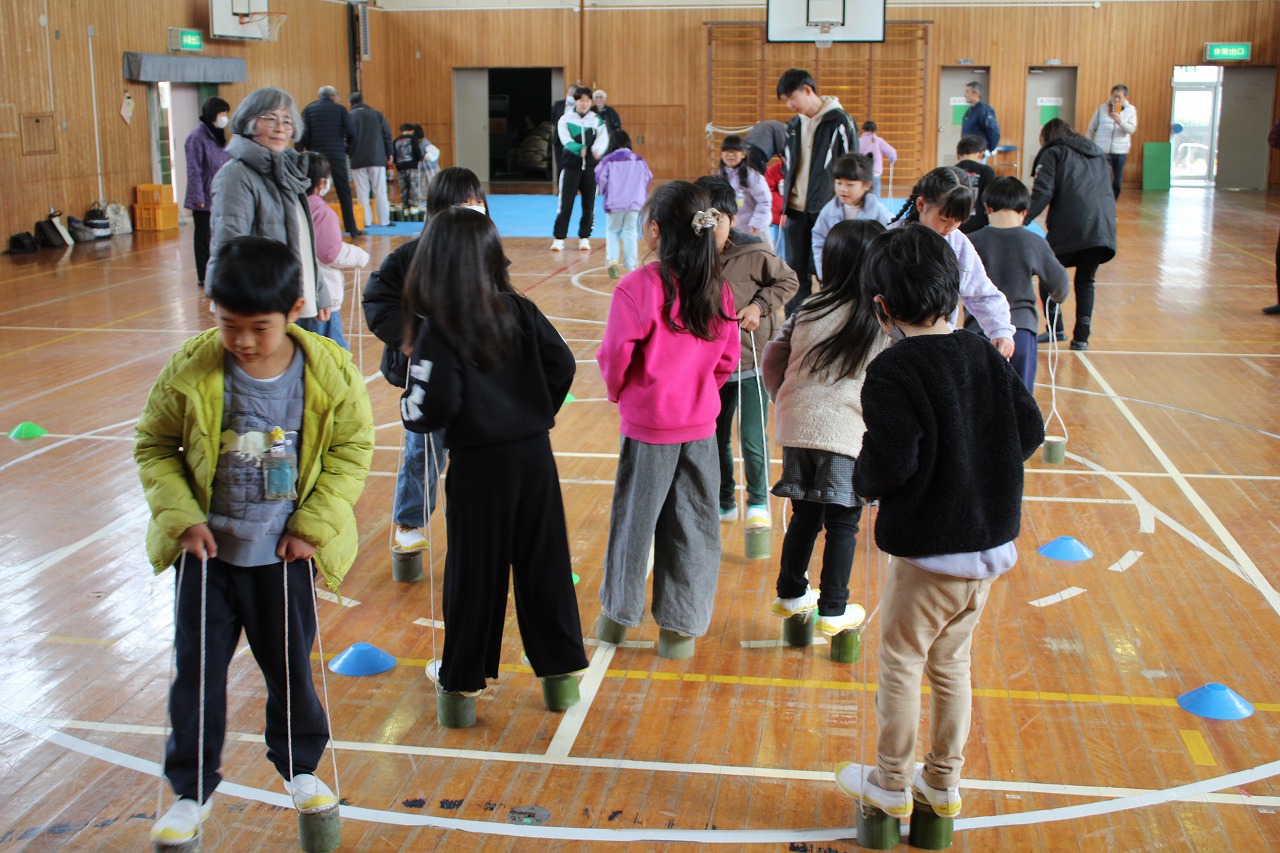 また,今日の5時間目は,内小応援隊の方々に来ていただき,1年生が昔遊びの竹ぽっくりを体験しました。竹ぽっくりにあいている穴に,子どもたちが紐を通しました。いざ乗ってみると,最初はおそるおそる乗っていましたが,こつをつかむと上手に乗れるようになりました。竹ぽっくりは,高さが低いものと高いものを1人2つもらいました。学校でしばらく遊んだら持ち帰ります。おうちでも,ぜひ楽しんでください。