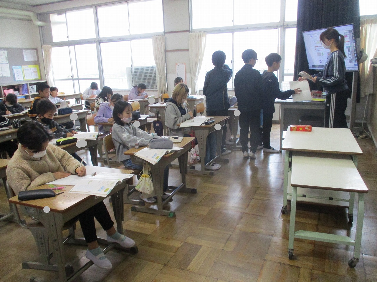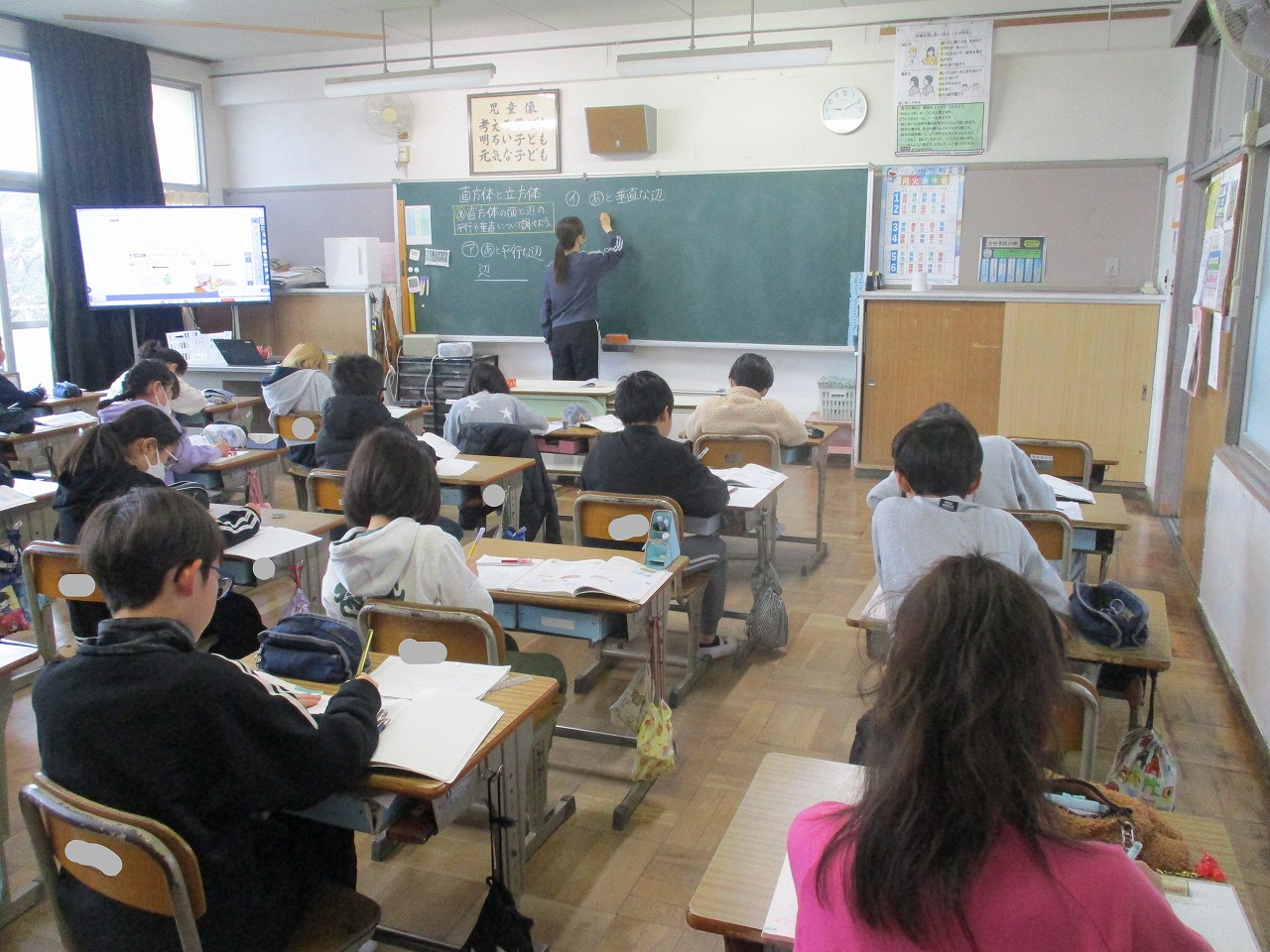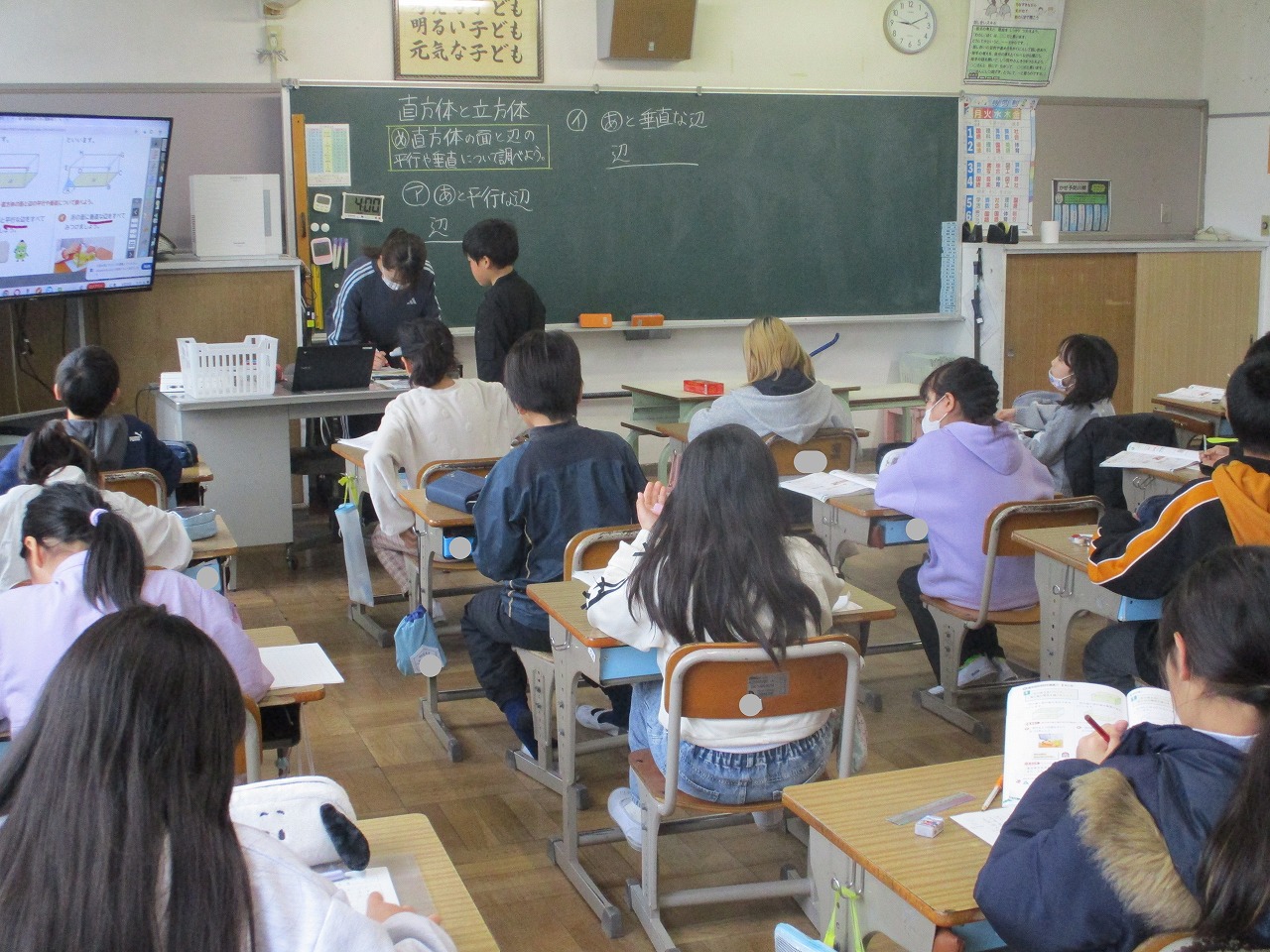 今日の1時間目は,4年生が算数の勉強をしていました。今日は,直方体の面と辺の平行と垂直について調べていました。解けた子は先生に見せるために並んでいました。全部,解けましたか。