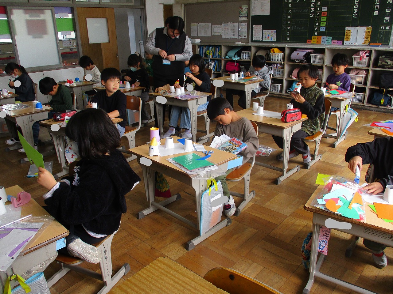 今日の3時間目は,2年生が図画工作で作品作りをしていました。「とびだせぴょーん」という作品で,紙コップと輪ゴムを使って飛び出す仕組みを利用した作品でした。ロケットを作ったり海の生き物を作ったり,どの子も一生懸命に作っていました。どんな作品ができるのか楽しみですね。